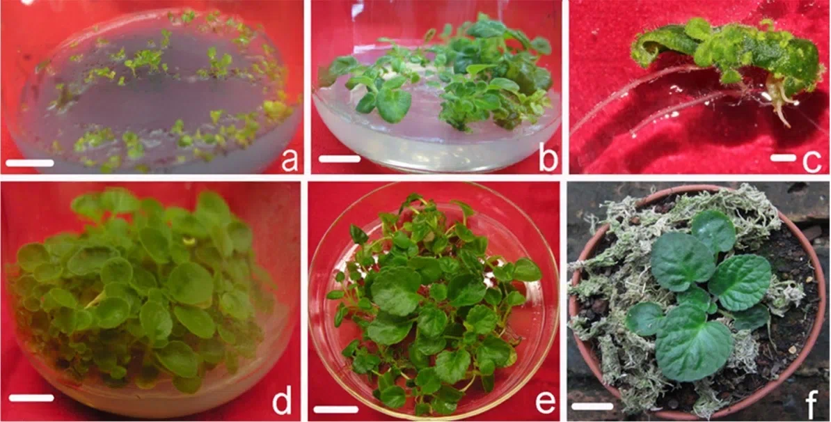 图1.弥勒苣苔在MS培养基上的再生. (a) 种子在含有0.5%活性炭的MS培养基上萌发10周. (b) 无菌种子在MS培养基上培养9周后萌发无菌苗.(c) 在含有2 mg L-1 BA和0.1 mg L-1NAA的MS培养基上培养1个月后,从外植体中产生的不定芽. (d)在含有2.0 mg L-1 BA 和 0.1 mg L-1 NAA 的MS培养基上培养14周后从不定芽长出的小植株. (e) 发育良好的幼苗被分离出来,准备移植. (f)将幼苗移栽到含有2:1 (v/v)腐殖质:红壤的土壤混合物的花盆中。比例尺为1cm。